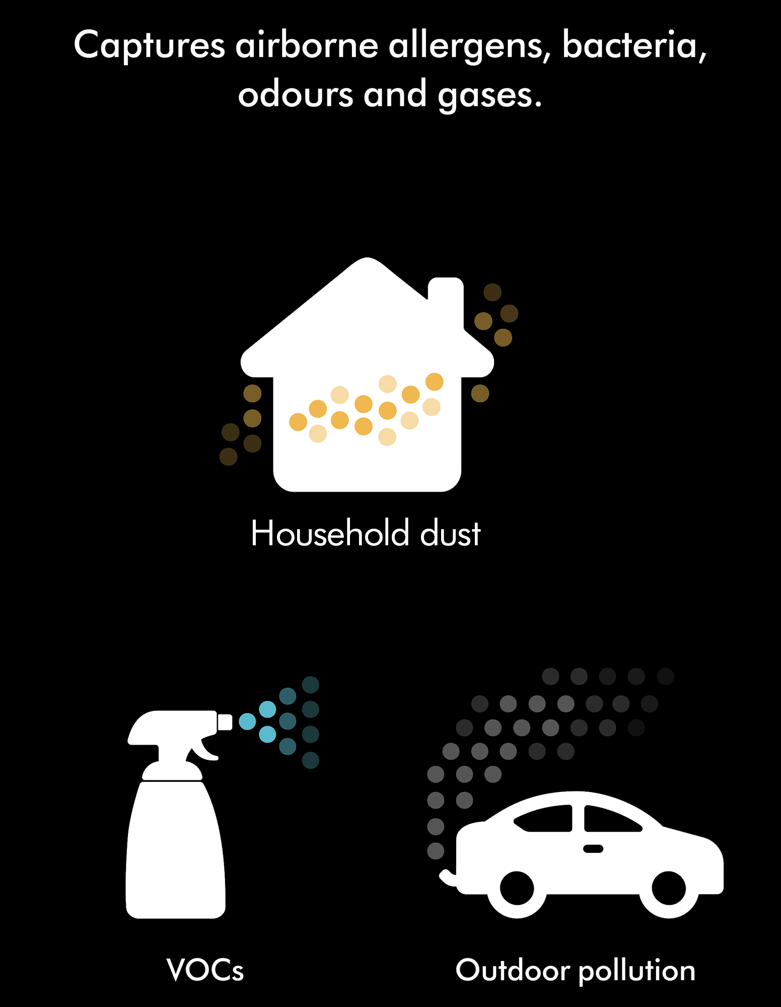 Removes pet and cooking odours, and even gases such as NO2. Traps airborne pollutants on a highly porous surface, capturing unpleasant smells and harmful gases.