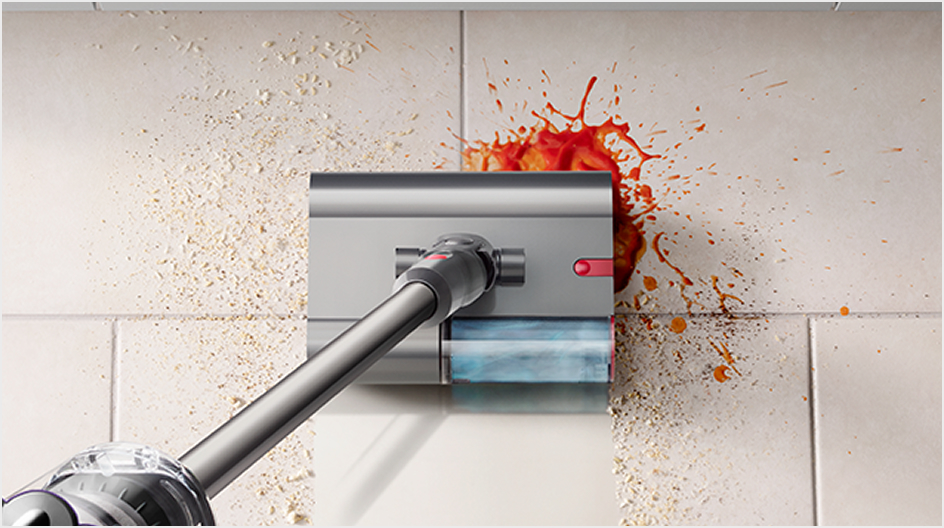 Motorised microfibre wet roller removes spills and tough stains from kitchens, dining rooms, hallways and bathrooms.