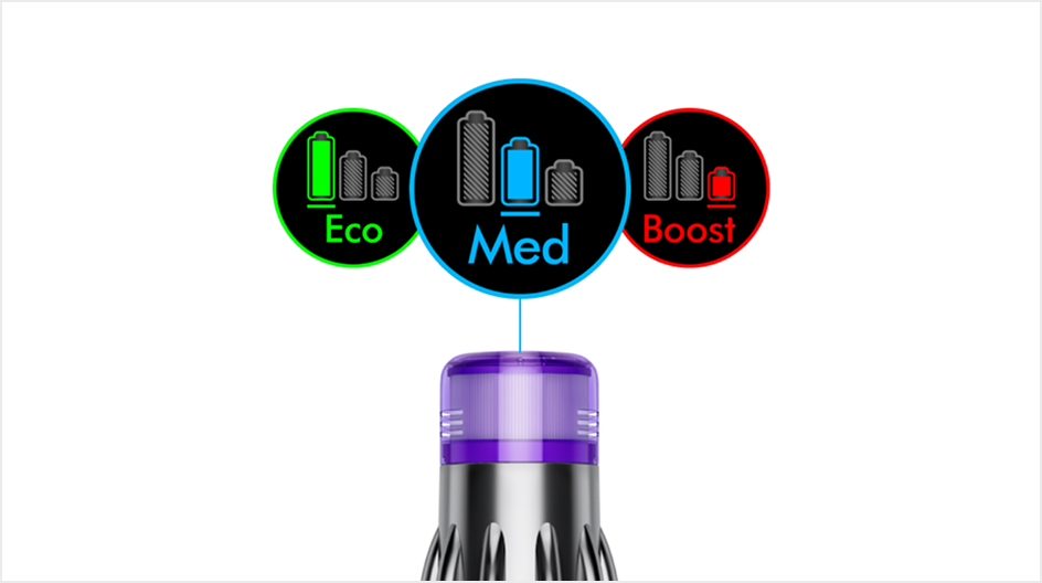 LCD screen shows remaining run time plus current power mode, filter maintenance reminders and blockage reports.