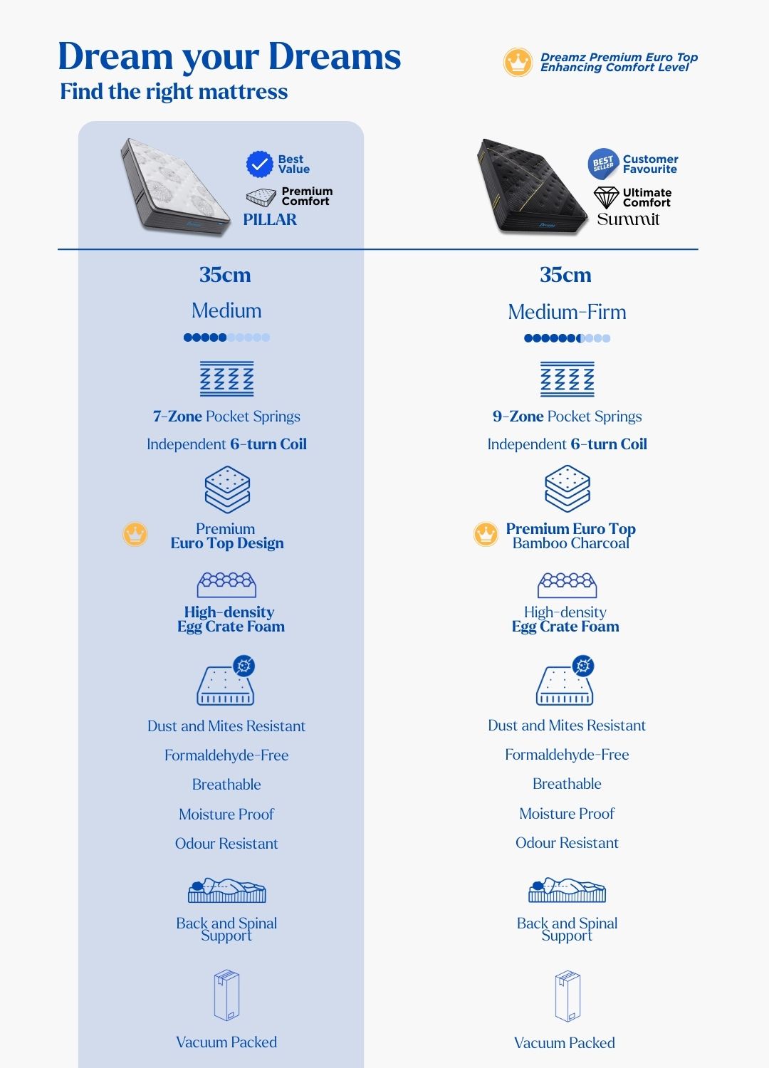 Dont’ worry! We have just picked our premium mattress SUMMIT and compared their key features for you, so you can easily find your best Dreamz without hassle.