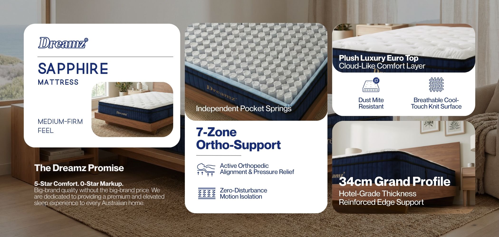 Your bedroom is your sanctuary, and the Dreamz Sapphire Collection is designed to be its centerpiece. We engineered the Sapphire for one purpose: to bring the structural opulence of a luxury hotel bed directly to your Australian home—without the 5-star markup.