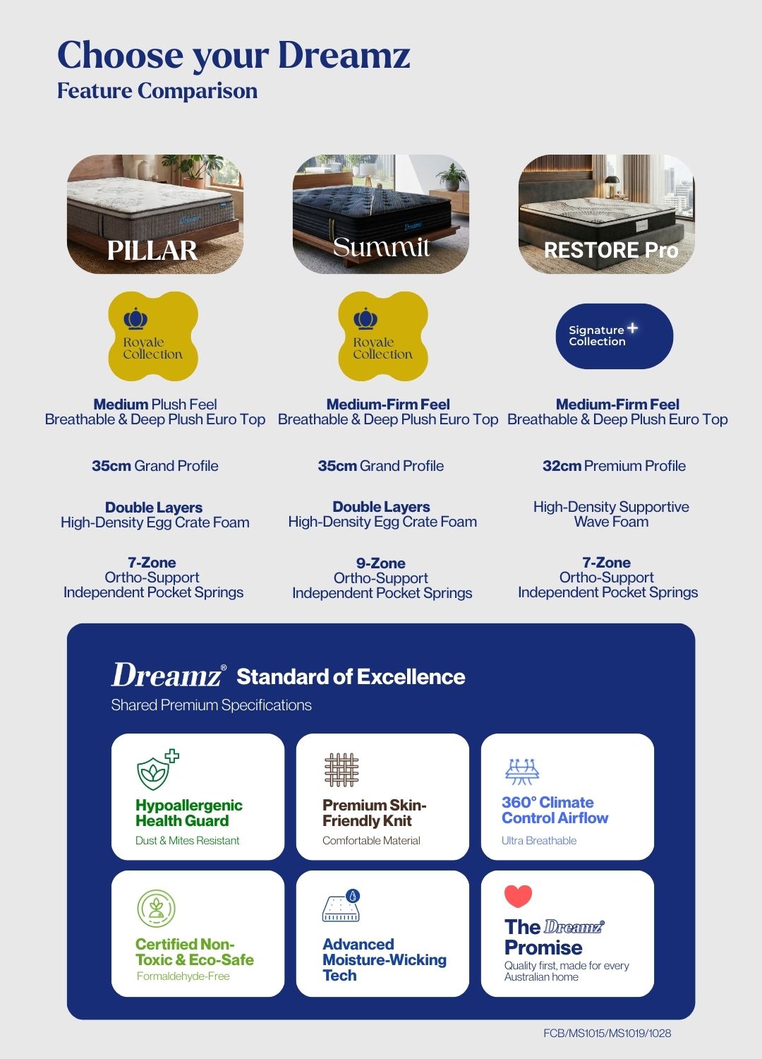 To make your decision easier, we’ve compared this Pillar mattress against two of our other best-sellers across different collections. Whether you want maximum luxury or a smart budget-friendly choice, compare the features below to find your perfect match.