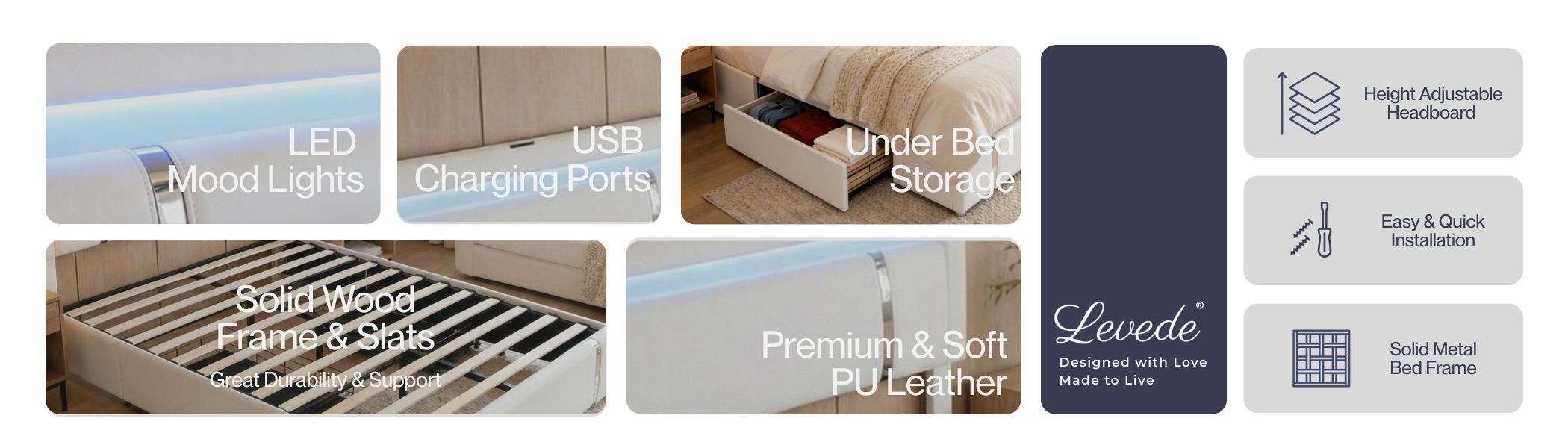 Upgrade your bedroom with the Levede bed frame, featuring a soft PU leather backrest and an adjustable-height headboard for personalized support. The integrated USB charging ports keep devices powered, while three‑sided RGB LED light strips set the perfect mood. With two spacious side drawers and durable slatted support, this Levede bed frame blends smart storage and robust construction for a restful night. Constructed from a sturdy powder‑coated steel frame, the Levede bed frame offers even weight distribution and noise‑free performance. Quick to assemble and built to last, the bed frame includes dust‑proof drawer liners and a thoughtful embedded design. Transform your space with this bed frame built for comfort, convenience, and contemporary style.